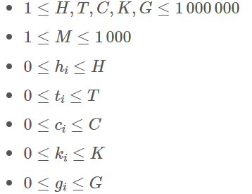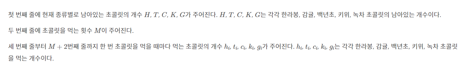 - 각 종류별 먹는 초콜릿 수의 합은 처음에 있던 종류별 개수보다 작거나 같음이 보장된다.