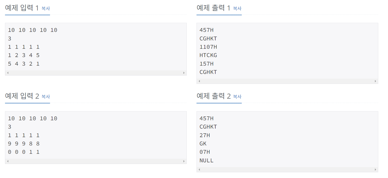 - 남아있는 개수가 동일한 초콜릿의 종류가 여러 개일 경우에는 알파벳 순으로 먼저 오는 것이 앞으로 오도록 적는다.